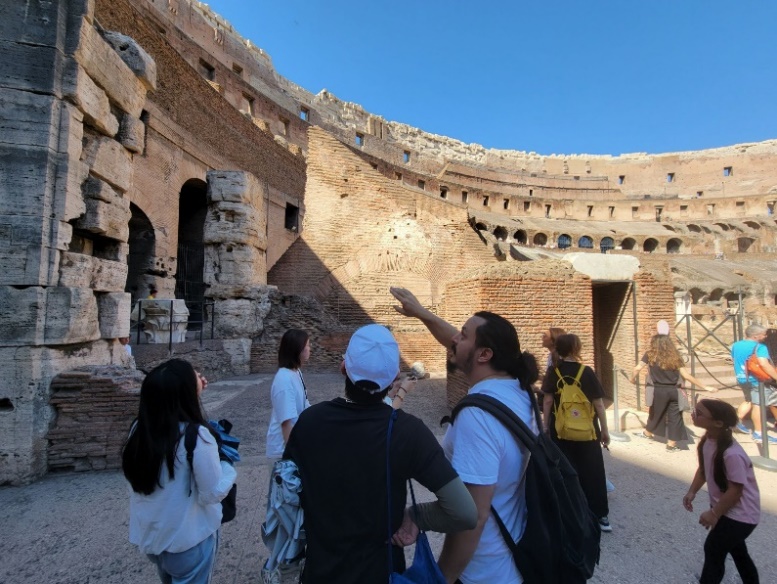 The professor from the University of Rome introduced that the Colosseum, built in AD 72, is one of the symbols of the ancient Roman Empire and was used for gladiatorial contests, animal hunts, and public spectacles. Team members learned about the construction techniques, functional layout, and historical background of the Colosseum, understanding its significant status in ancient Roman society. They were amazed by the grandeur and complex structure of the Colosseum, admiring the exceptional wisdom of Roman engineers and the superb craftsmanship of the workers.